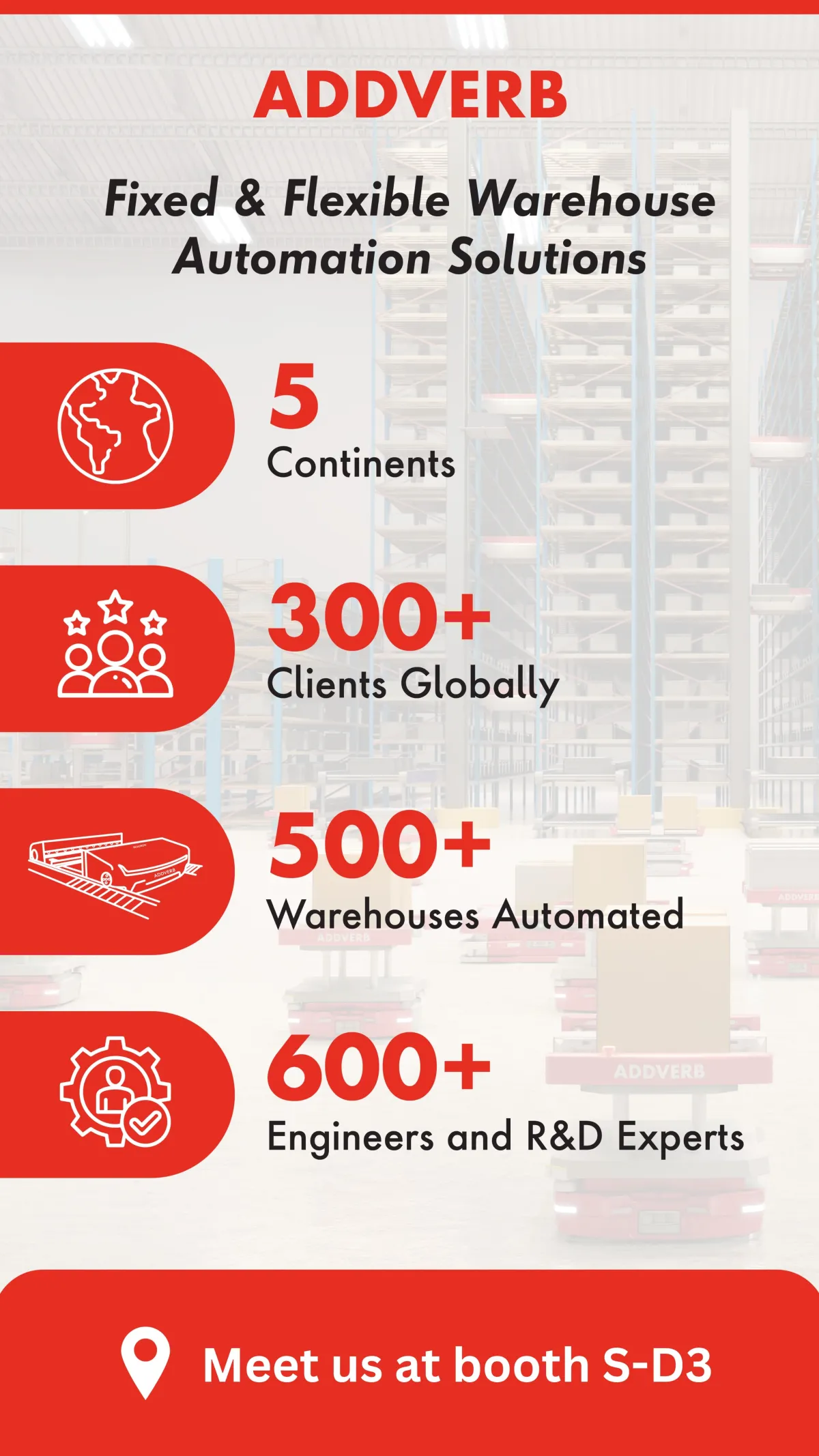 Addverb is a robotics company that designs, manufactures and delivers end-to-end warehouse automation solutions, offering businesses a competitive edge by transforming their supply chain operations. Our large portfolio includes AMRs, AGVs, ASRS, Picking Technologies, as well as in-house AI-enabled Software like WMS, WCS, WES and FMS. We automate varied intralogistics processes from inbound to outbound including storage, picking, sorting, material handling. With a strong clientele such as Unilever, Amazon, Reliance, Siemens, Landmark, Coca-Cola, DHL, we have a global presence with a major focus in EMEA, APAC and Americas.